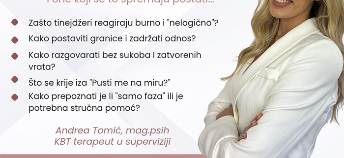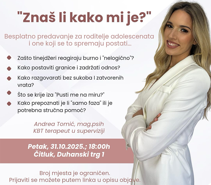 Dragi roditelji adolescenata (i svi oni koji se to spremaju postati)! Potaknuta svakodnevnim događajima u našoj sredini (a i šire), kao i sve većim brojem susreta u svom savjetovalištu s adolescentima, njihovim pitanjima, borbama i nesigurnostima, ali i s vama, roditeljima koji često dolazite s jednakom dozom brige, ljubavi, straha i preispitivanja; odlučila sam organizirati jedno besplatno predavanje i zajedničko druženje, upravo za vas.